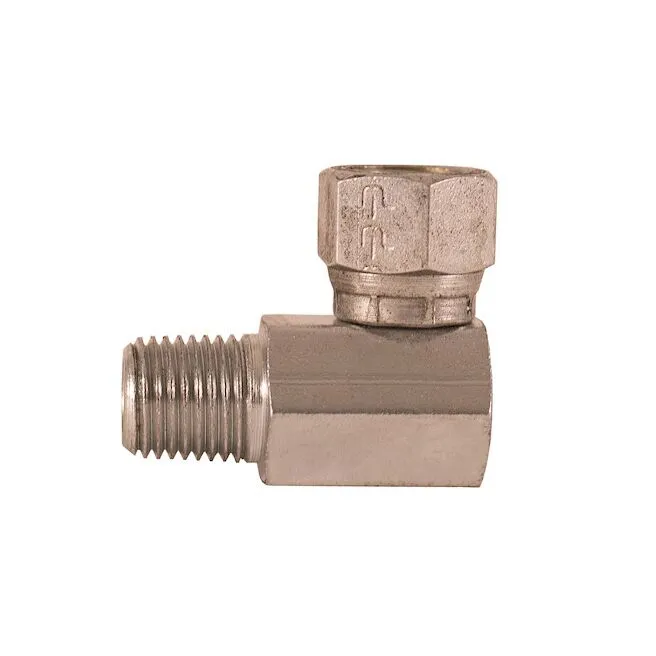 The Female Pipe Swivel to Male Pipe 90 Degree Elbow adapter is part of the Buyers Products line of swivel adapters. These adapters make a metal-to-metal seal to a male pipe. They feature tough carbon steel construction, a tight, secure connection, and a corrosion-resistant zinc finish.