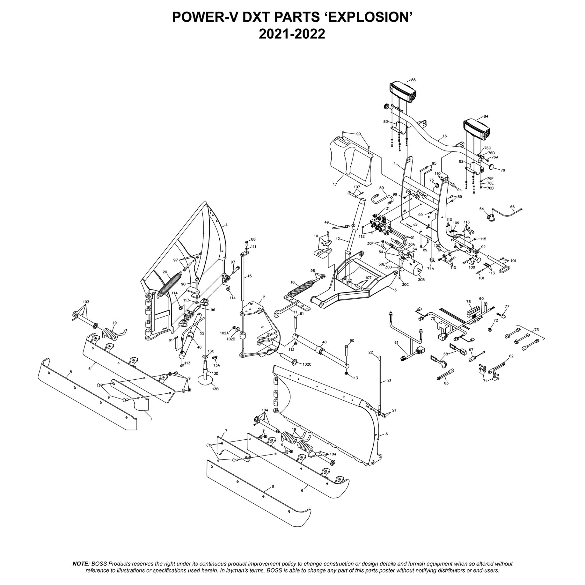 NOTE: BOSS Products reserves the right under its continuous product improvement policy to change construction or design details and furnish equipment when so altered without reference to illustrations or specifications used herein. In layman’s terms, BOSS is able to change any part of this parts poster without notifying distributors or end-users.